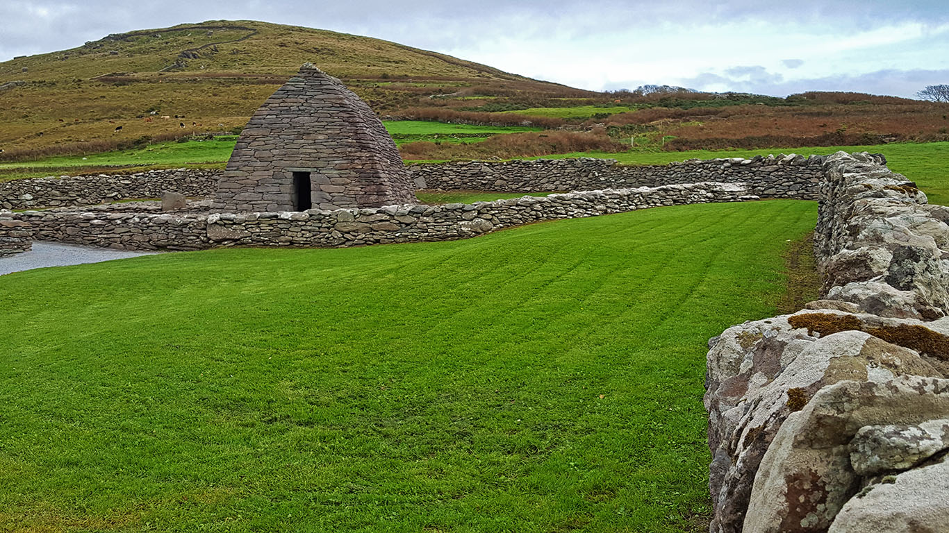 The ancient Gallarus Oratory sits serenely among the fields at the foot of Mount Brandon, the highest peak on the Dingle Peninsula.