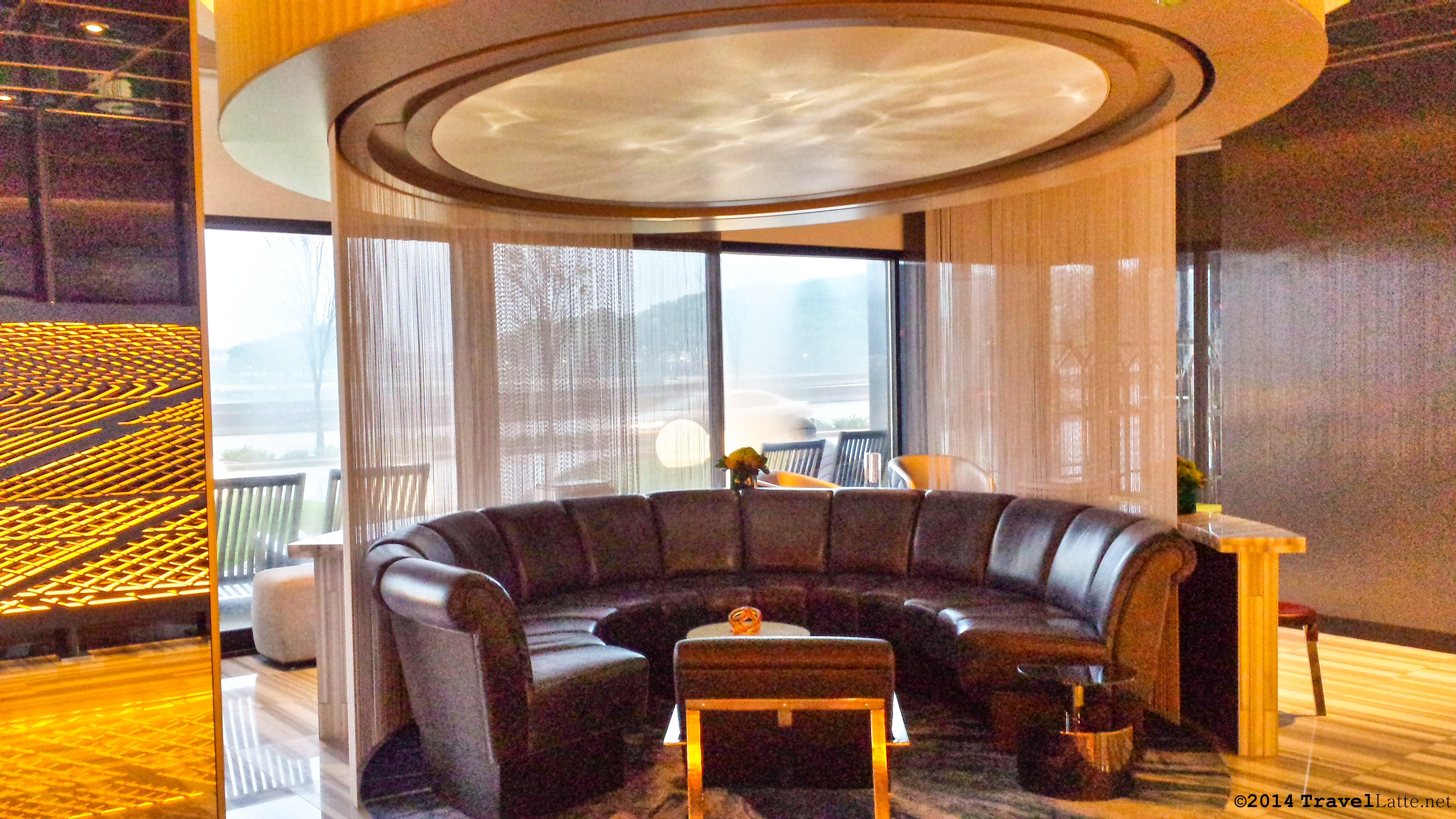 The lobby featured several conversation “pods” surrounded by beaded curtains and a table with outlets behind each one.